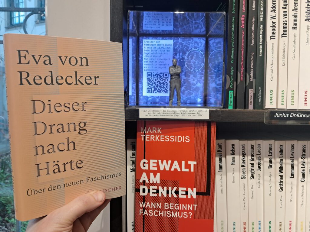 Eigentlich möchten wir uns nicht mit Menschen wie Wolfram Weimer auseinandersetzen, wirklich nicht. Das macht weder Spaß, noch ist es konstruktiv. Eigentlich möchten wir ja nur spannende Bücher verkaufen, ab und zu eine Lesung veranstalten, lokale Projekte unterstützen und dabei möglichst „unser Ding“ machen können. Kultur wird von Menschen gemacht, für Menschen. Eine ernstzunehmende Kulturpolitik würde das unterstützen, ohne dabei restriktiv einzugreifen, oder aktiv dagegen vorzugehen – beispielsweise in Form von Einschüchterungen. Die Auseinandersetzung mit Weimers „Politik“ ist deshalb dringend notwendig. Wir können in der aktuellen Kulturpolitik eine eindeutige Tendenz erkennen, dass mehr die Interessen der Politik im Vordergrund stehen, als die Kultur selbst (Quellen gibt es inzwischen genug, u.a. zur Berliner Fördergeldaffäre der CDU1). Und nun, nicht weil es erbaulich ist, aber weil es nötig ist, zwei Literaturempfehlungen „Dieser Drang näch Härte“ und „Gewalt am Denken“ . (Foto: diese beiden Buchtitel neben unserer kleinen Kunstinstallation „August Landmesser“ nach dem Kunstwerk von Fernando Sanchez Castillo anlässlich der Jubiläumsausstellung des Felix Nussbaum Hauses 2023)