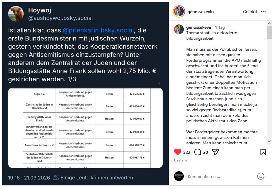 - Im ursprünglichen Blog-Artikel zum Skandal des Deutschen Buchhandlungspreises fragten wir: „Die flächendeckende Streichung von Fördermitteln von Demokratieprojekten ist bereits geplant. Was kommt danach?“ Nun ja, Ministerin Prien bewantwortet das wie folgt:54